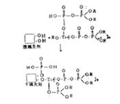 3. 配位型: 是一種在通常的四烷基鈦酸酯上附加了亞磷酸酯從而在改進(jìn)耐水性的同時(shí),又能產(chǎn)生含磷化合物的功能性產(chǎn)品。代表性產(chǎn)品化學(xué)式如下: