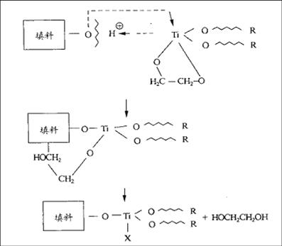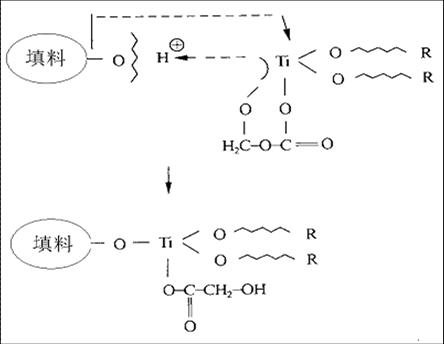 4.配位型 : 該類偶聯(lián)劑可避免四價(jià)鈦酸酯在某些體系中的副反應(yīng),如在聚酯中的酯交換反應(yīng),在環(huán)氧樹脂中與羥基的反應(yīng),在聚氨酯中與聚醇或氰酸酯的反應(yīng)等。該類偶聯(lián)劑在許多填充劑體系中都適用,有良好的偶聯(lián)效果,其偶聯(lián)機(jī)理與單烷氧基型類似: