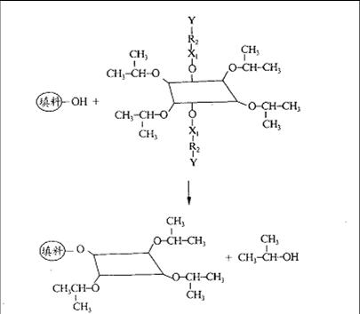 2.單烷氧基焦磷酸酯型 : 該類鈦酸酯適合于含濕量較高的填充體系,如陶土、滑石等。在這些體系中,除單烷氧基與填充劑表面的羥基反應(yīng)形成偶聯(lián)外,焦磷酸酯基還可以分解形成磷酸酯基,結(jié)合一部份水:如下式反應(yīng)